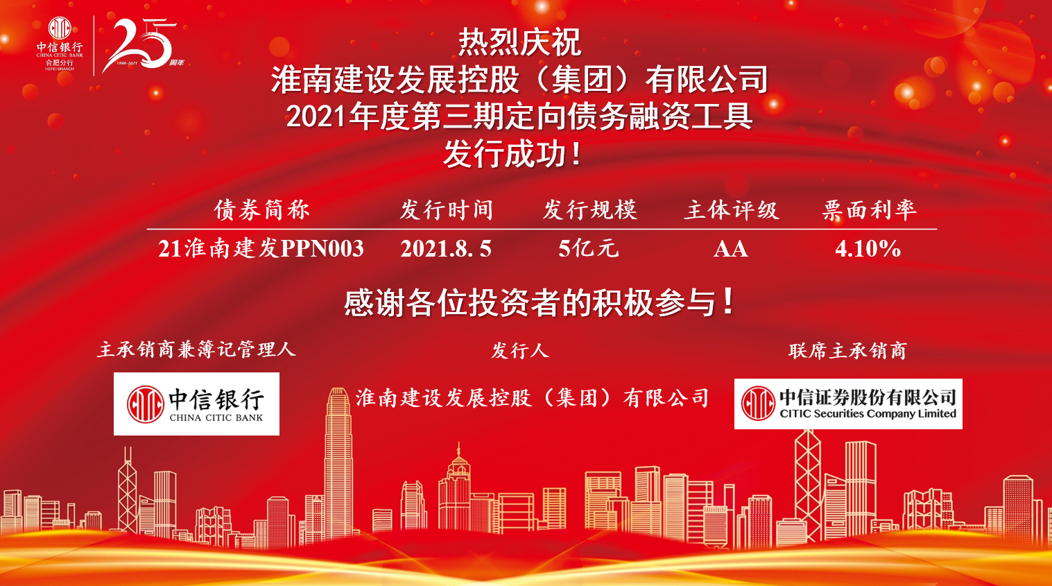 8月5日,淮南建设发展控股(集团)有限公司2021年度第三期定向债务融资工具(PPN)5亿元成功发行,期限1年,票面利率4.1%。发行过程中,我公司克服困难,拓展市场,联系债券承销商中信银行、中信证券,与投资者多次进行沟通,保障本期债券成功发行,票面利率在同业中处于较好水平。