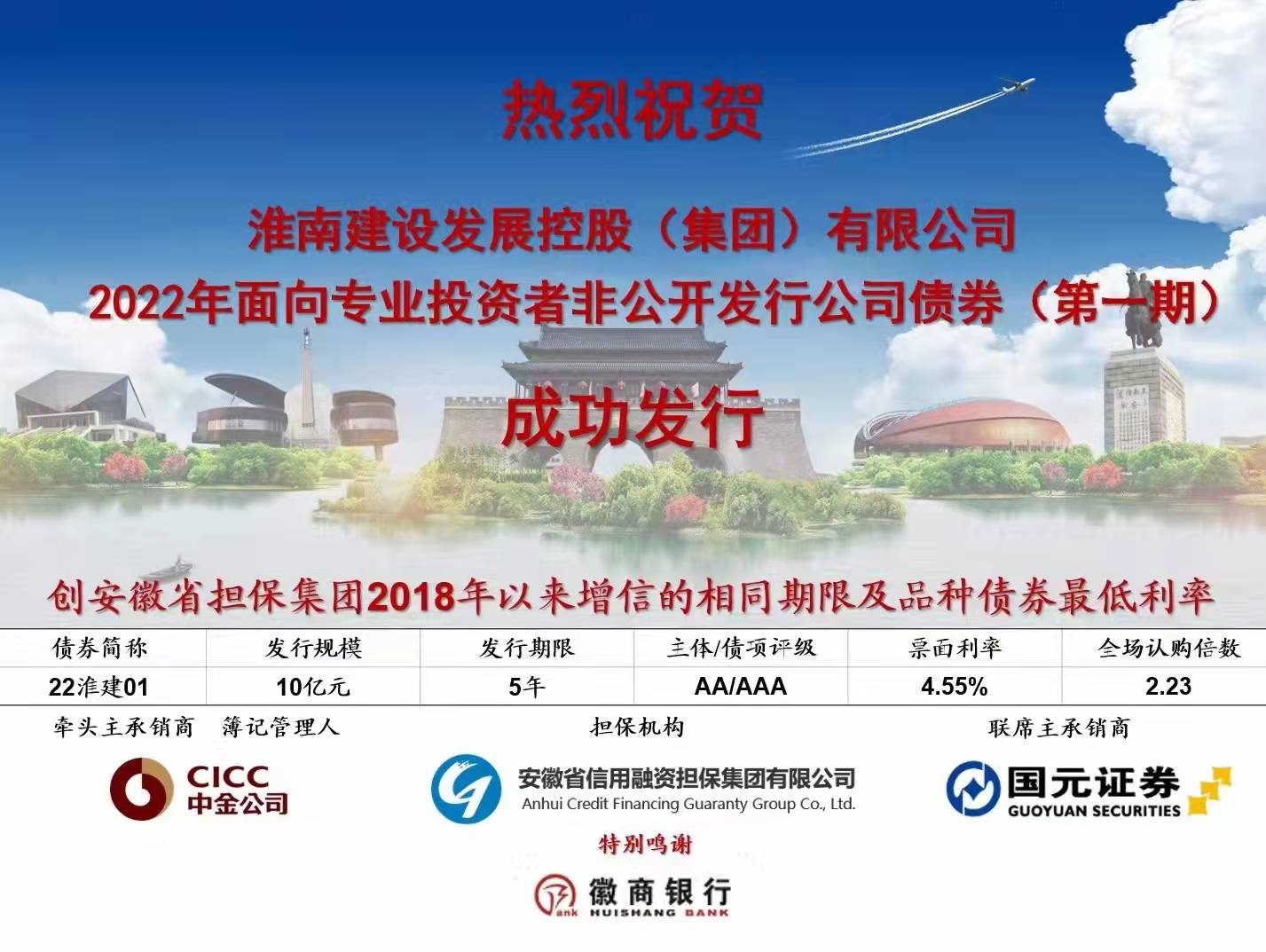 1月12日,bv1946伟德官网成功簿记发行公司首单非公开发行公司债券,债券简称:20淮建01、发行规模10亿元、票面利率4.55%,安徽省担保公司对债项增信担保,认购倍数达2.23倍。