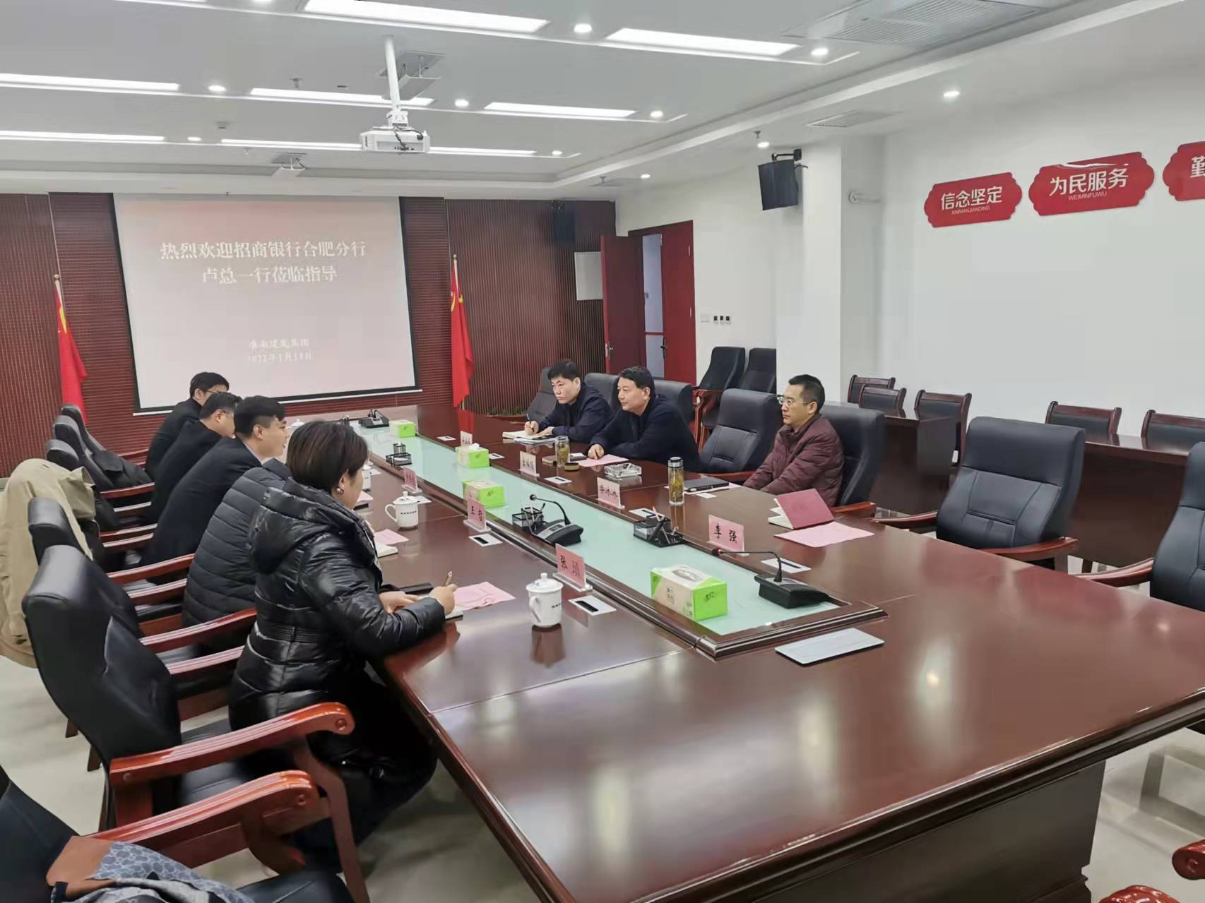 1月14日上午,集团公司党委委员、董事、副总经理宫福顶接待了到访的招商银行合肥分行投资银行部副总经理卢伟玮、招商银行淮南分行副行长孙方东一行,双方就债券融资、项目贷款等融资业务进行深入交流。