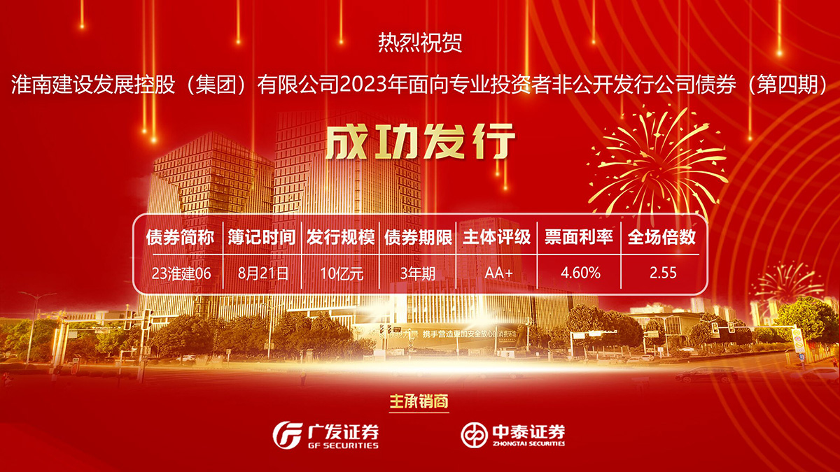 8月21日,淮南建设发展控股(集团)有限公司2023年第四期非公开发行公司债成功簿记发行,发行规模10亿元,全场认购倍数2.55倍,票面发行利率4.6%。